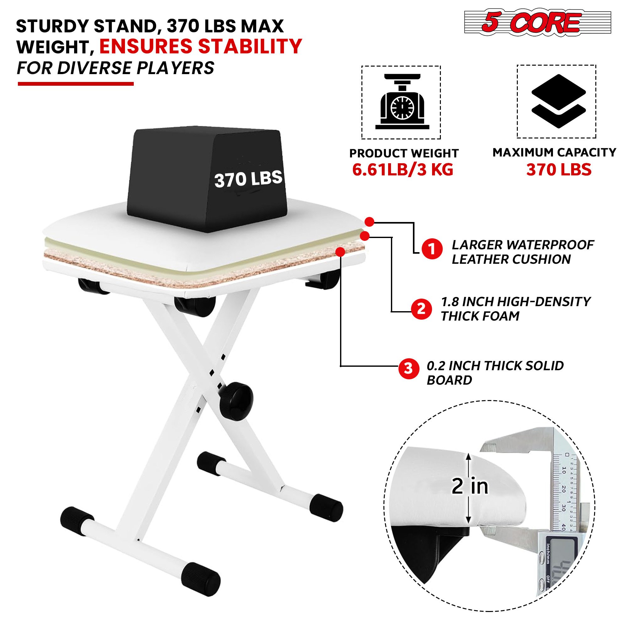 Experience ultimate comfort with our key board bench, featuring 2 inch thick sponge padding. Easily adjust the height from 12 to 18.5 inches to suit any player. Constructed with heavy duty metal alloy and reinforced joints, this piano stool ensures durability. Anti slip rubber pads ensure stability, even during intense performances. Its foldable design makes transport and storage effortless. The premium seat cover, made from breathable materials, enhances comfort. With superior stability and exceptional build quality, our piano stool is perfect for every musician. The 4 hole adjustment mechanism allows for quick height changes, ensuring the ideal playing position. |