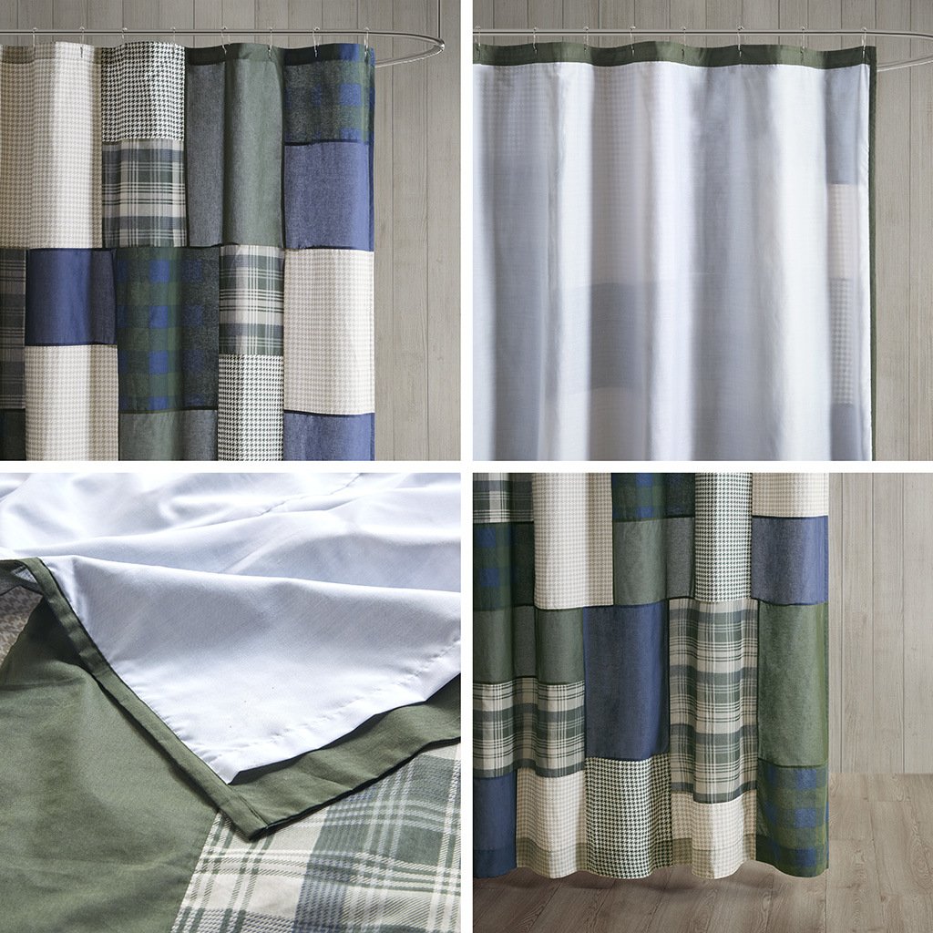 Create a cozy cabin look in your bathroom with the Woolrich Mill Creek shower curtain. This 100% cotton shower curtain features a pieced plaid patchwork design in green, navy, and taupe hues for an inviting lodge feel, while the light weight cotton base fabric provide a naturally, soft and airy touch. Machine washable for easy care, this casual style shower curtain measure 72"x72" and is finished with 12 button holes at the top making it easy to hang; hooks, rod, and a water repellant liner are not included and will need to be purchased separately. Complete the look with coordinating bedding, available and sold separately.