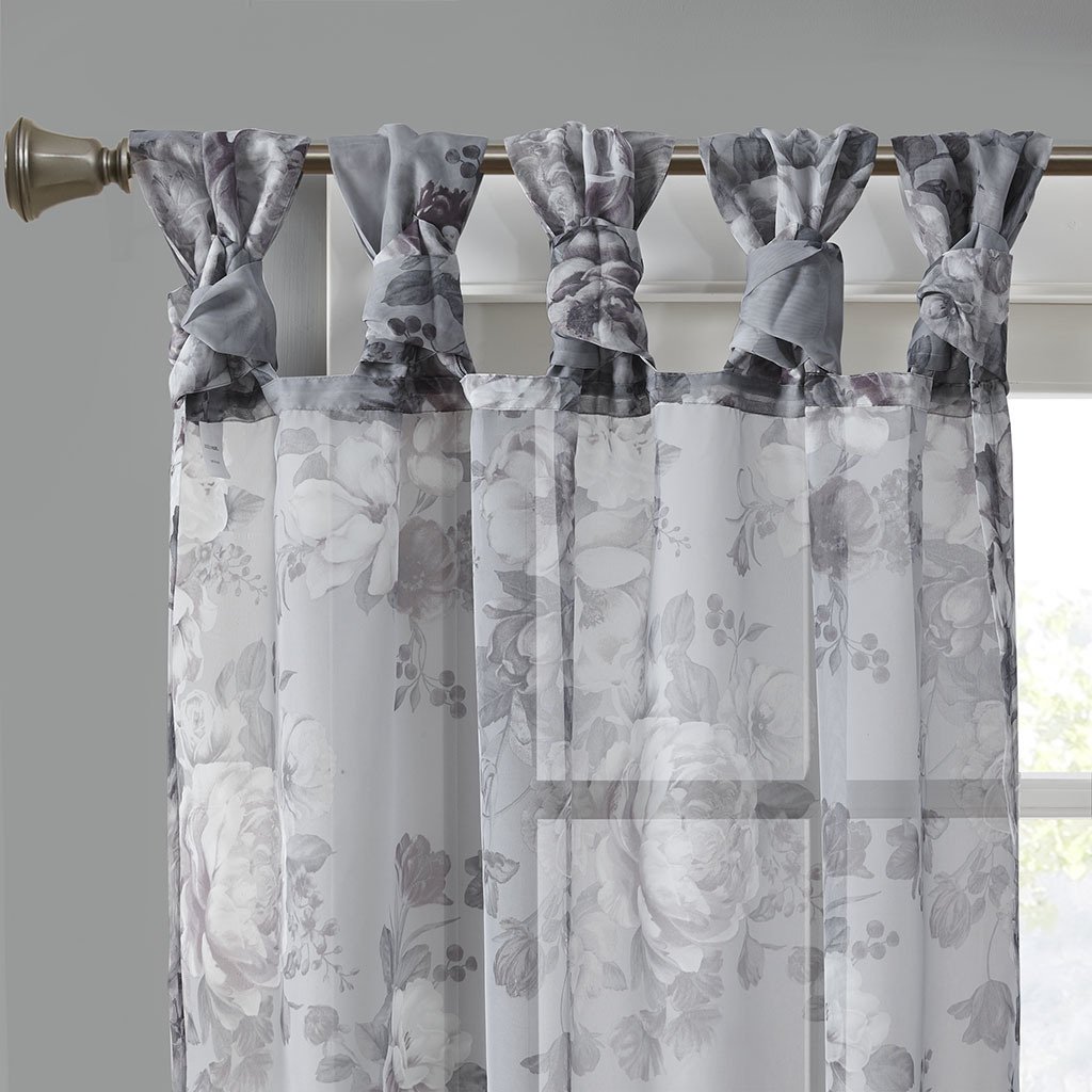 The Madison Park Simone Printed Floral Twist Tab Top Voile Sheer brings a soft and romantic touch to your home decor. This voile sheer curtain panel features a beautiful mauve and neutral printed floral on a dark grey ground for a rich and stylish contrast, while the lightweight fabric adds a delicate and airy touch. Our twist tab top finish allows you to create a DIY design for a unique and stylish touch to your window decor; assembly required for twist tabs - printed directions are included in packaging and video support also available onsite. Each panel is sold separately and machine washable for easy care; Fits up to a 2" diameter curtain rod. These curtains are perfect on its own as a decorative sheer or even better when layered with either coordinating scarf or our Madison Park Emilia solid twist tab panels for a more intricate update!