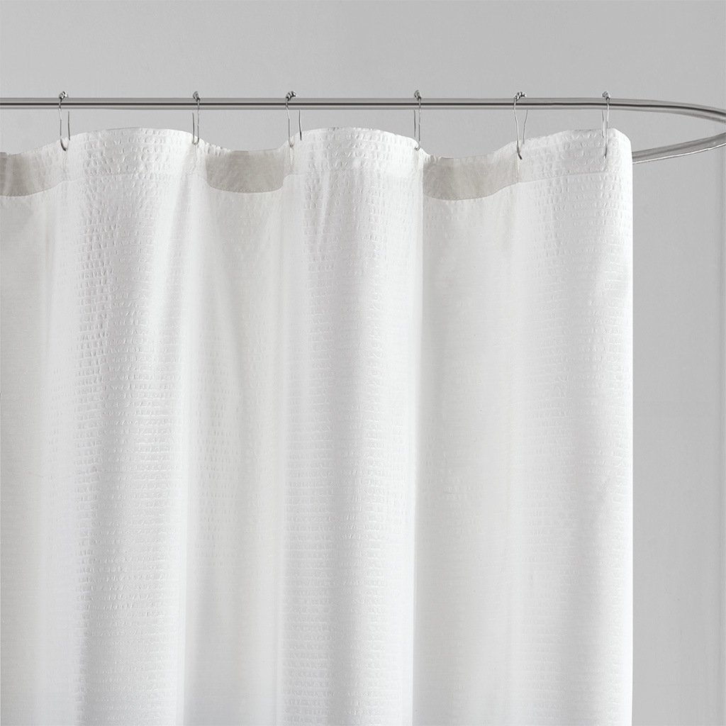 Add a refreshing touch to your bathroom decor with our Madison Park Ara Ombre Printed Seersucker Shower Curtain. This shower curtain features a blue ombre print on an embossed seersucker fabric, for a contemporary look that's rich in texture. The lightest color of the ombre design starts at the top and gradients to a darker color towards the bottom for a naturally soothing look. Machine washable for easy care, this contemporary shower curtain measures 72"x72" and is easy to hang with the 12 button holes at the top. A water repellant liner is not included, and highly recommended for the utmost protection.