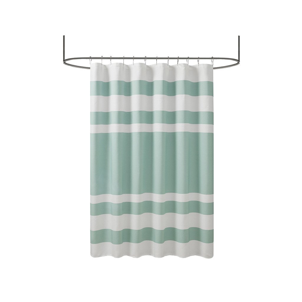 Update your space with the Madison Park Spa Waffle Shower Curtain with 3M Treatment. Featuring a fresh and updated stripe design, this shower curtain is made of a light heathered colored fabric pieced with a white waffle weave base creating a beautiful texture for the perfect spa touch to your decor. A temporary 3M Scotchgard water repellent treatment keeps your curtain looking newer, longer and is active for multiple washes. A waterproof liner is not included but still highly recommended to keep this shower curtain in its best condition; Hooks and Rod also not included and should be purchased separately. Various colors and sizes are available to fit any bathroom space. Size shown in image is standard 72x72", stripe design may vary per all other sizes. Complete the collection with coordinate Spa Waffle Bath Towel and Spa Cotton Bath Rug, available and sold separately.