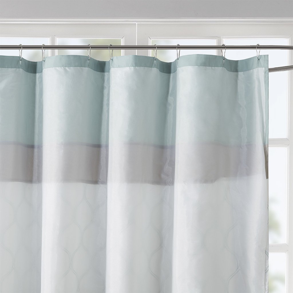 The 510 Design Shawnee Printed and Embroidered Shower Curtain adds a sophisticated flair to your bathroom decor. Featuring a printed and pieced design, this shower curtain flaunts an elegantly intricate pattern in beautiful seafoam hues for a traditional look. Embroidered detailing adds texture and charm to the design, while an additional lining provides better drapability and added privacy. Made from soft microfiber, this embroidered shower curtain is machine washable and brings a luxurious update to your bathroom.