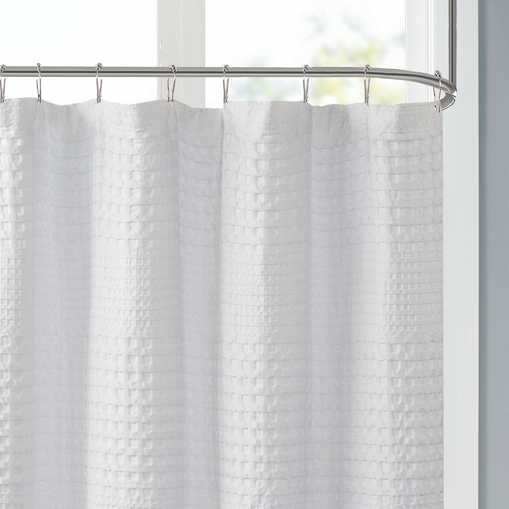 Give your bathroom a spa-like allure with the Madison Park Arlo Super Waffle Textured Solid Shower Curtain. This solid White shower curtain features a heavy waffle weave base fabric that creates a rich texture for a simple and stylish update. The medium weight fabric allows a natural and rich drapability, while the 100% cotton provides the perfect natural touch. Each shower curtain is machine washable for easy care and finished with 12 button holes at the top, making it easy to attach hooks and hang on rod (hooks and rod not included). A water repellant liner is not included, but highly recommended to ensure the best care and handling of this rich medium weight shower curtain. Coordinates perfectly with the Madison Park 800 GSM Bath Towel Collection.