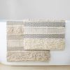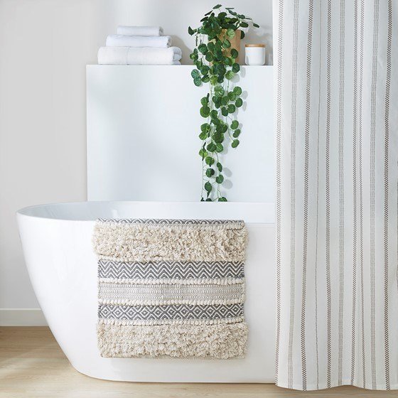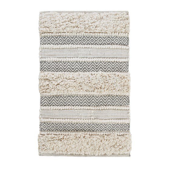 Globally inspired with an artisan touch, the INK+IVY Asher Woven Texture Stripe Bath Rug is the perfect update to refresh your bathroom decor. This hand-woven bath rug features a combination of beautiful patterns, shaggy textures, and fabric techniques in a vertical stripe layout, for a stylish Boho look and feel. The shaggy woven texture is featured in a solid light light natural hue, which alternates between a grey geo pattern and fabric manipulation technique to create soft dimension and a unique design. Machine washable for easy care; this rug is also finished with a Non-skid resistance latex backing to help keep the rug in place throughout the day. Complete the look of this New INK+IVY bath rug collection with any of our coordinating INK+IVY Shower Curtain, Bedding, and Window Collections, available and sold separately.